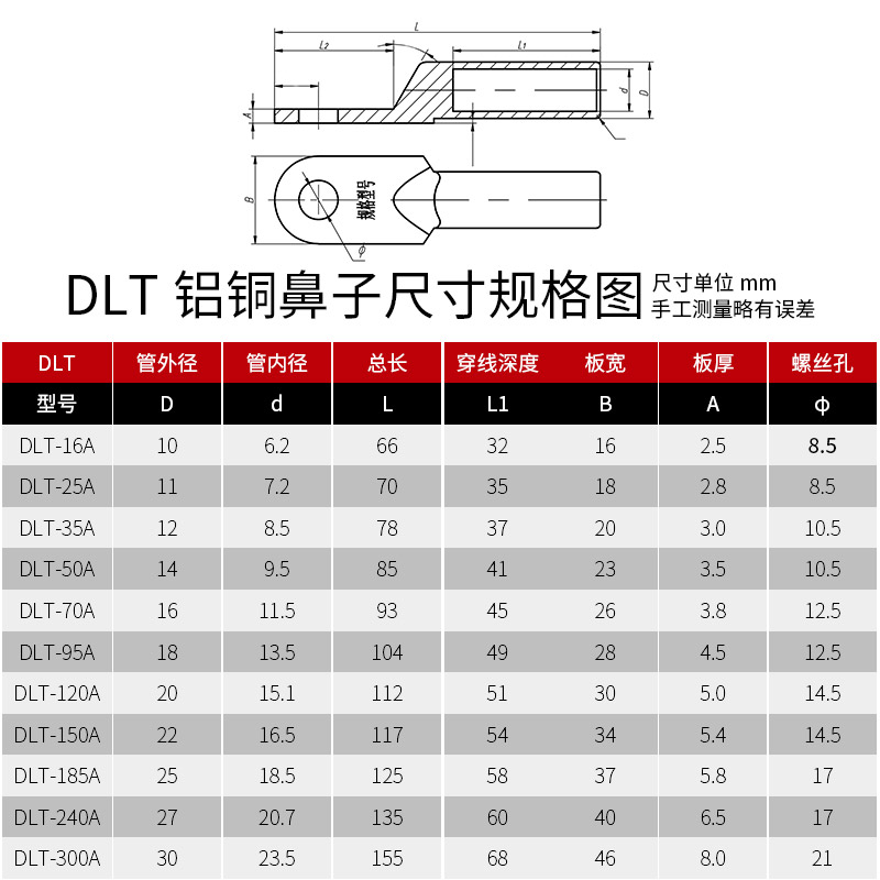 铝铜鼻子 国标DLT-95/120/150/185铜铝鼻子 倒反铜线铝接头 宇益电气 型号 | DTL | ||