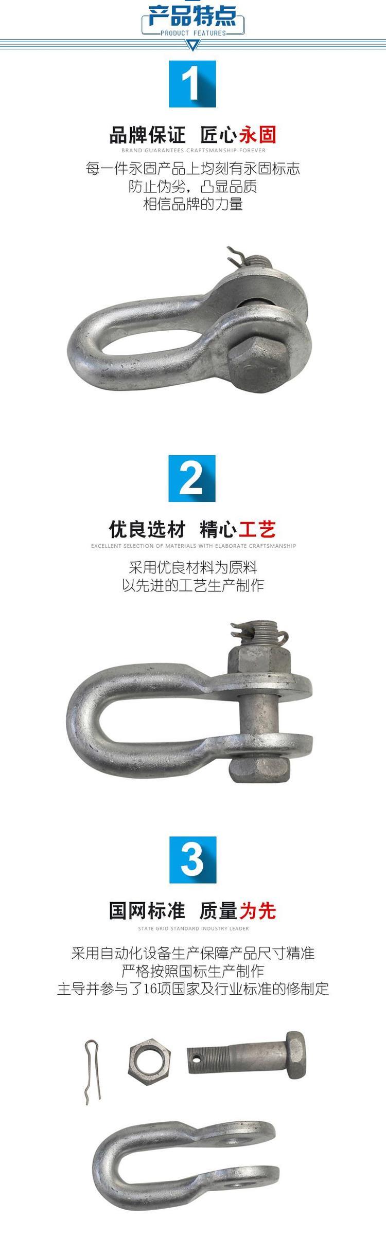U型挂环外形与卸扣很相似,但二者作用不同,卸扣是一种起吊用的锁具,表面处理多是电镀锌,而U型挂环则是用于供电线路上的热镀锌电力金具。这一点,在购买时要注意的。