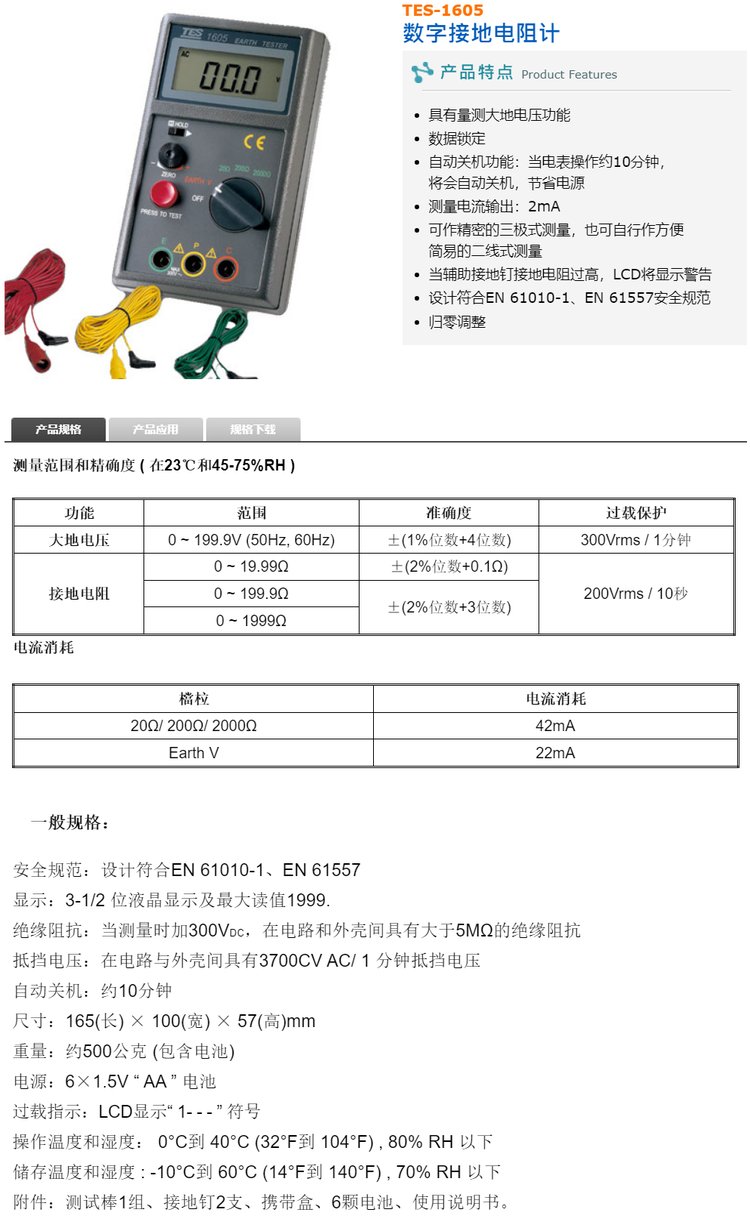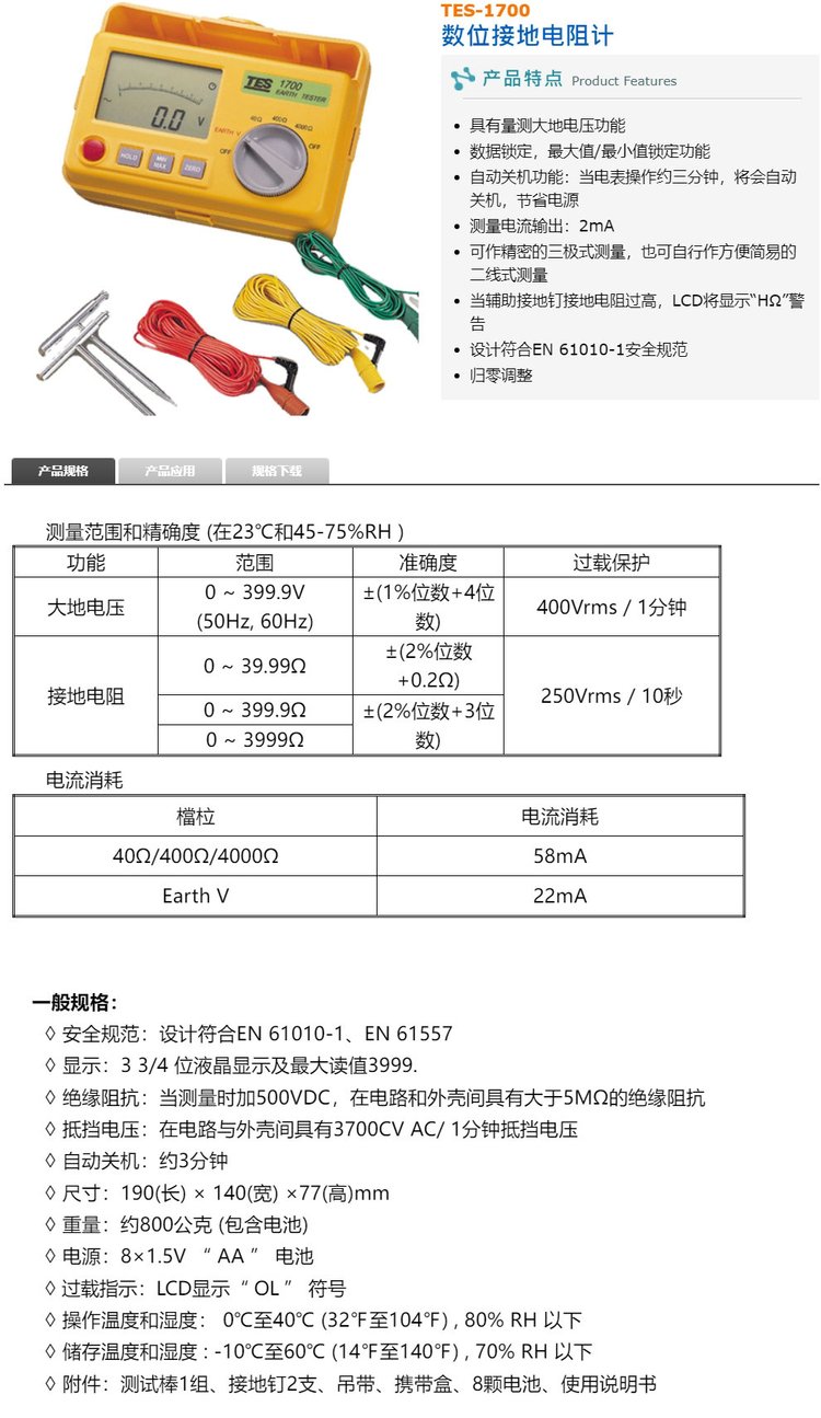 泰仕TES-1605/TES-1700接地电阻测试仪高精度打桩式接地电阻表 品牌 | 泰仕TES | ||