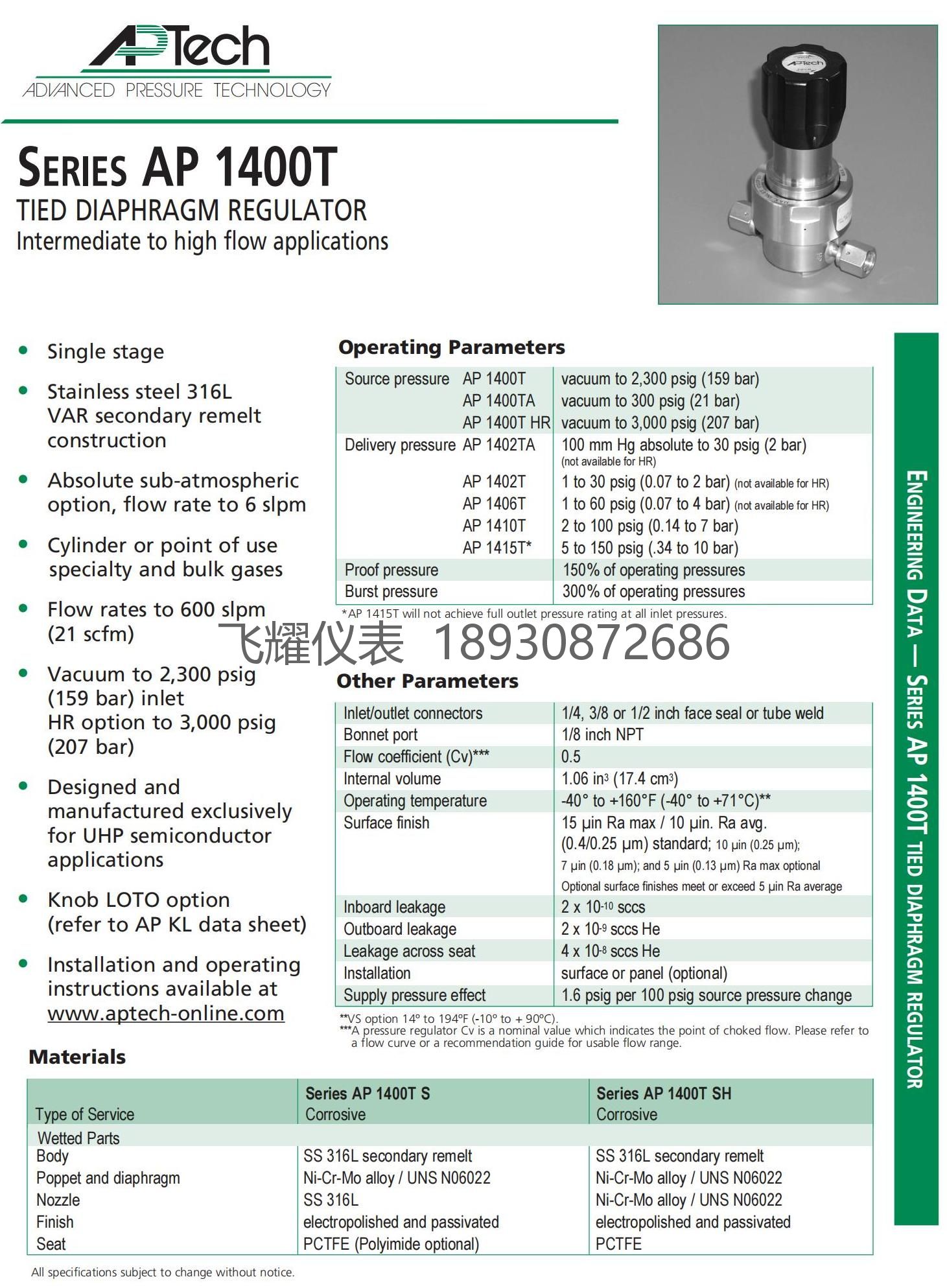 APTech主要产品: APTech压力调节器 APTech气动执行器、APTech气动阀门、APTech手动阀、APTech钢瓶调压阀. APTech高纯单级调压阀、APTech微型调压器、APTech单级高压调压阀、APTech手动隔膜阀、APTech安全阀、APTech单级减压阀、APTech双级减压阀,APTech流量开关、APTech真空发生器等等