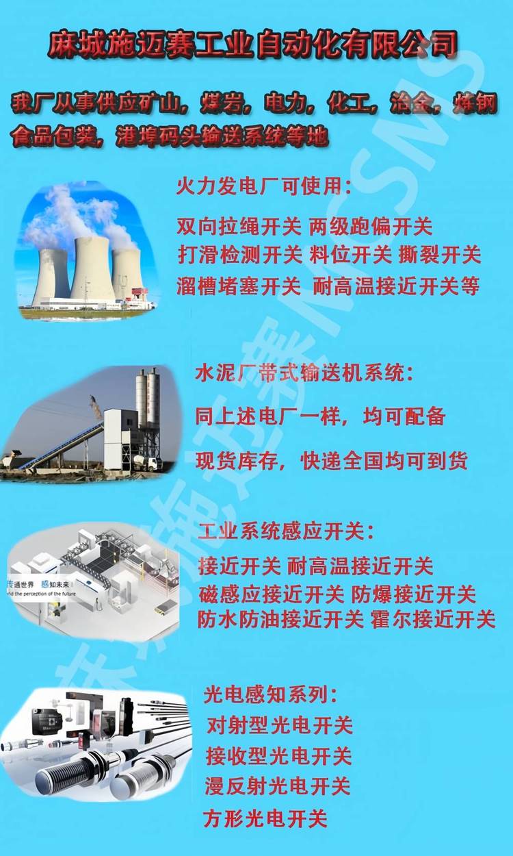 主营产品:接近开关、光电开关、两级跑偏开关、双向拉绳开关、霍尔开关、气缸磁性开关、防爆磁性接近开关、打滑开关、井筒开关、防撕裂开关、料位监测器、速度检测器、欠速开关、堆煤开关、煤流开关、倾斜开关、速度传感器、齿轮传感器、矿用电气、行程限位开关、皮带输送装置控制柜、矿用声光报警器、起重机配件、凸轮控制器、主令控制器、声光组合信号器等自动化工控。