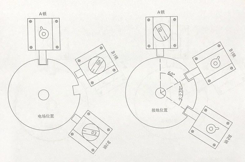 1.?图3为电场位置,A锁锁住隔离开关并保证B锁上的钥匙取不出;只有将上一级来的钥匙放入A锁上并按顺时针方向旋转180°打开A锁方可进行操作手轮,只有将手轮旋转到接地位置时,B锁上的钥匙方可取出;