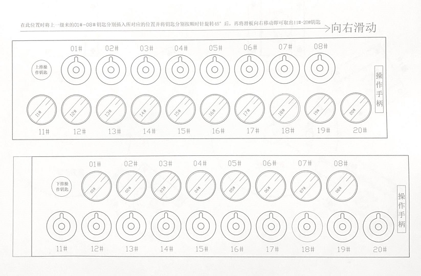 1.?上图为8进10出钥匙置换装置,逆向操作上图步骤可以取出10#-08#钥匙