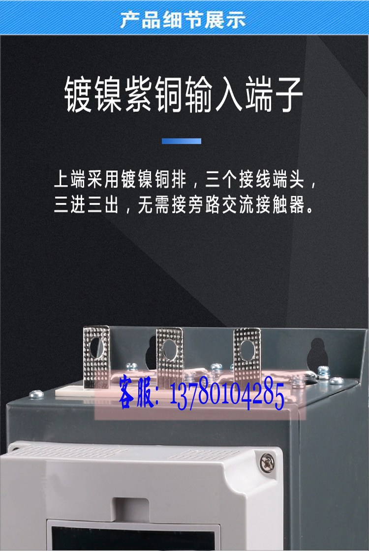 六是由于晶闸管和机械触头组合一体的设计,通过智能控制器实现了机械触头无电弧,使得机械触头的电寿命等于机械寿命,解决了接触器长期以来难以解决的问题,与旁路型软起动器相比大大提高了接触器的可靠性,它正好保留了在线运行软起动器和旁路运行软起动器的优点,还回避上述两种的缺点,是目前软起动器国际领先的技术。