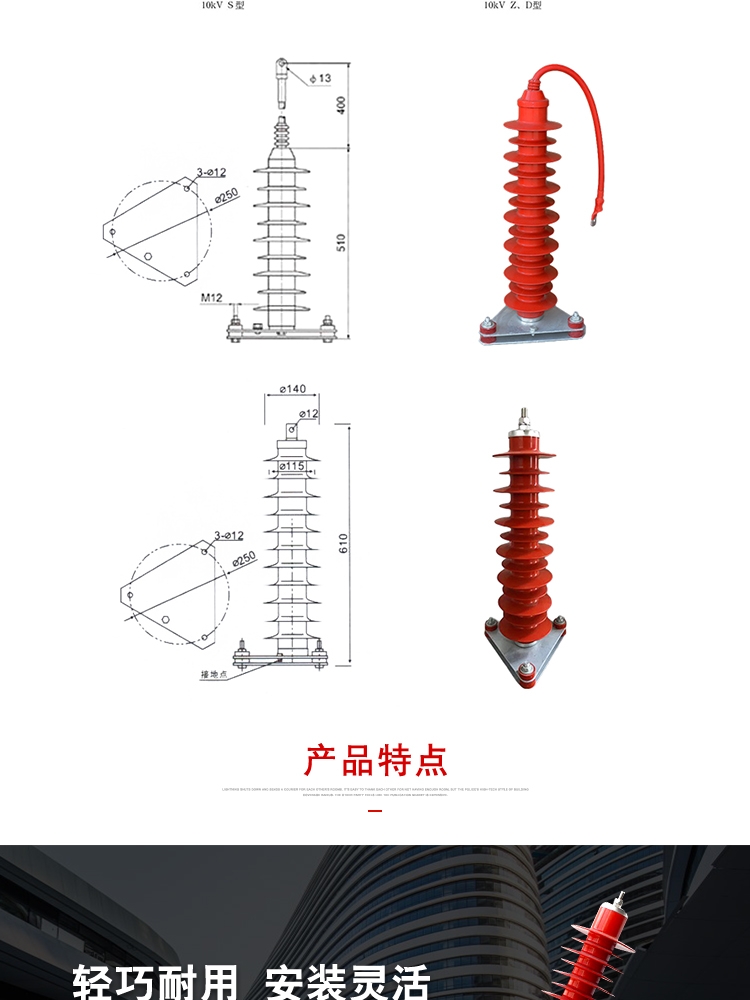 复合绝缘外套的采用,顺应了国际电力产品小型化,安全化,免维护的发展趋势。高分子有机复合材料与传统的陶瓷和玻璃等无机材料相比,具有体积小,重量轻,耐污秽免清扫,防爆防震动的优点。是集成化,模块化的中高压输变电成套设备中优选的防雷元件。