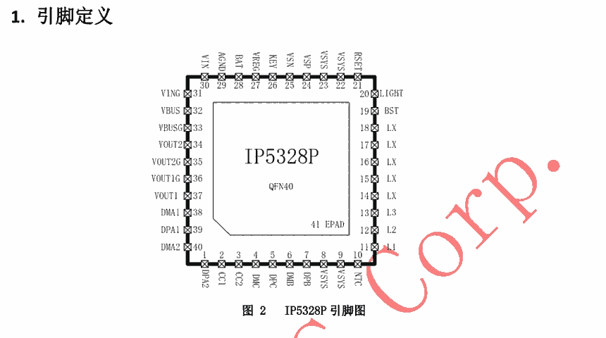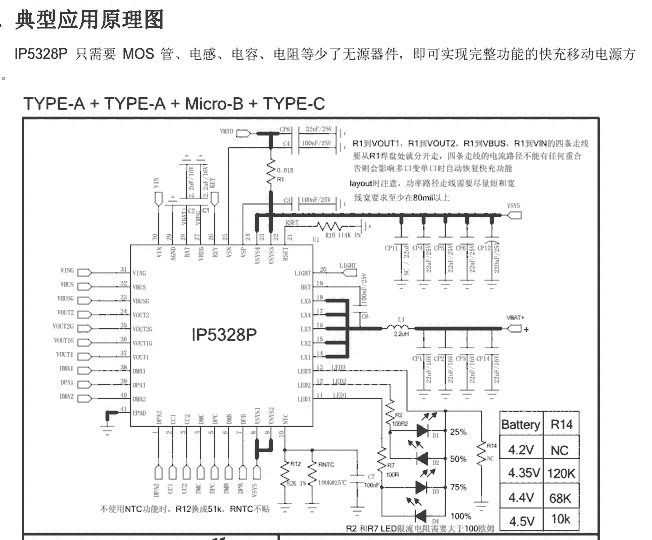 IP5328P 是一款集成 QC2.0 / QC3.0 输出快充协议、 FCP/AFC/SFCP 输入输出快充协议、MTK PE+ 1.1&2.0 输 出快充协议、USB C/PD2.0/PD3.0 输入输出协议、USB C PD3.0 PPS 输出协议、兼容BC1.2/苹果/三星手机、同步升 /降压转换器、锂电池充电管理、电池电量指示等多功能的电 源管理 SOC,为快充移动电源提供完整的电源解决方案。 可同时支持USB A x2,USB B,USB C 四个USB 口,单独 使用任何一个 USB 口都可以支持快充,同时使用两个及以 上输出口时,只支持5V。