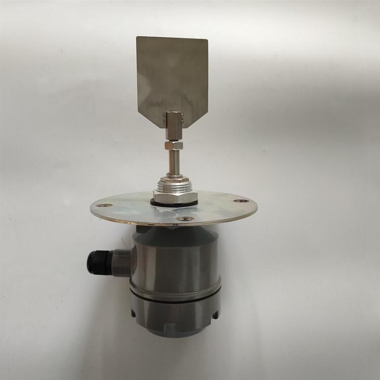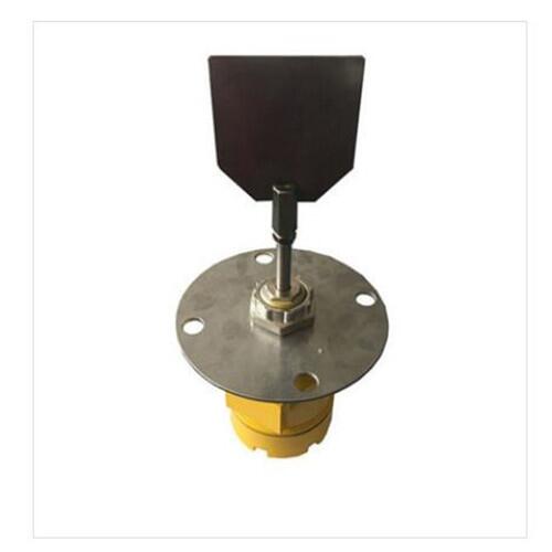 安装方法:设备安装于料仓侧壁,通过无刷同步电机驱动传动杆末端的测量桨叶旋转,当物料表面到达阻旋安装位置时,阻止桨叶旋转,内部电机被悬挂起来,产生反方向扭矩作用于微动开关上,输出干接点信号,同时使电机停转;当物料下降时,桨叶被释放,弹簧将电机拉回工作位置,微动开关回到初始位置,接点输出信号关闭。