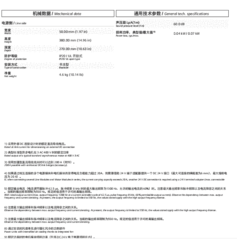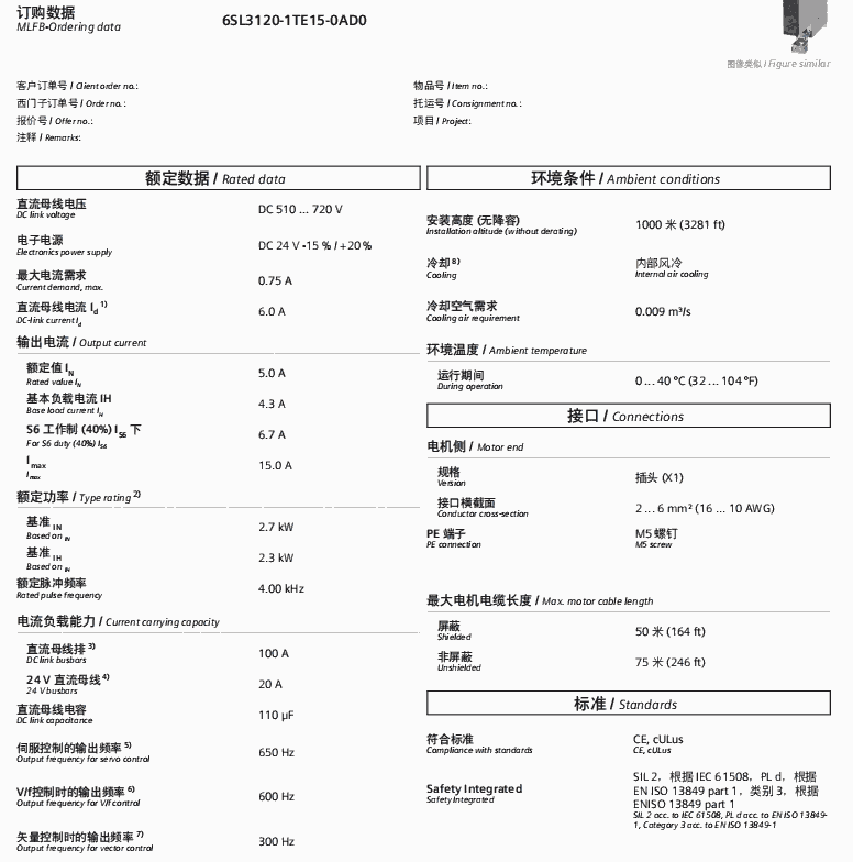 SINAMICS S120 单电机模块 输入:600V DC 输出:3AC 400V,5A 结构形式:书本型 D 型 内部风冷 优化的脉冲图形和 支持扩展 安全集成功能 包含 DRIVE-CLiQ 电缆