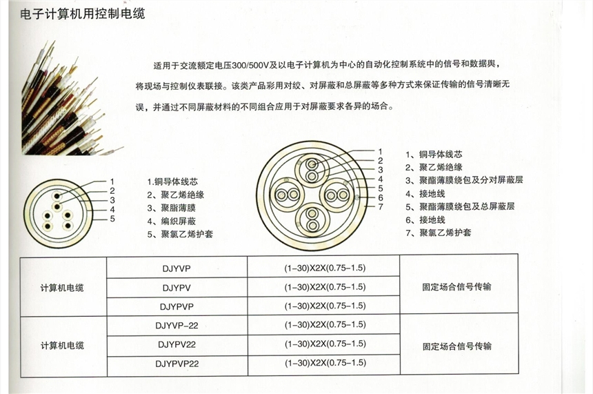 2)MKVV22、MKVV20;4-61芯(0.5-10mm²); MKVV32、MKVV30;7-61芯(0.5-10mm²); MKVVR;2-61芯(0.5-6mm²); MKVVRP;2-61芯(0.5-4mm²); MKVVP22、MKVVP2-22 ;4-61芯(1.5-10mm²); MKVVP2-22-1; 4-61芯(1.5-10mm²);MKVV-1、MKVV22-1;2-61芯(0.5-10mm²);主要运用于500KV配电站与发电站配电设备及强磁场影响区。