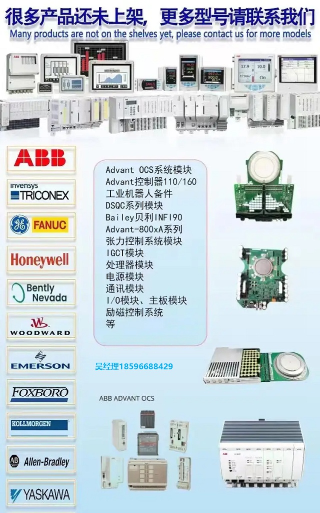 公司的优势品牌有:ABB、西门子、施耐德、A-B、发那科、安川 、横河、博世力士乐、本特利、西屋、HIMA、伊顿、瑞恩 、施耐德、艾默生、拉摩托罗、SEW、普洛菲斯、霍尼韦尔、英维思、库卡等各类的DCS系统配件,机器人系统配件,大型伺服系统备件。(进口原厂,专业冷门、偏门、停产、紧急、缺货各类电子元器件配件、您找不到的型号物料等等)
