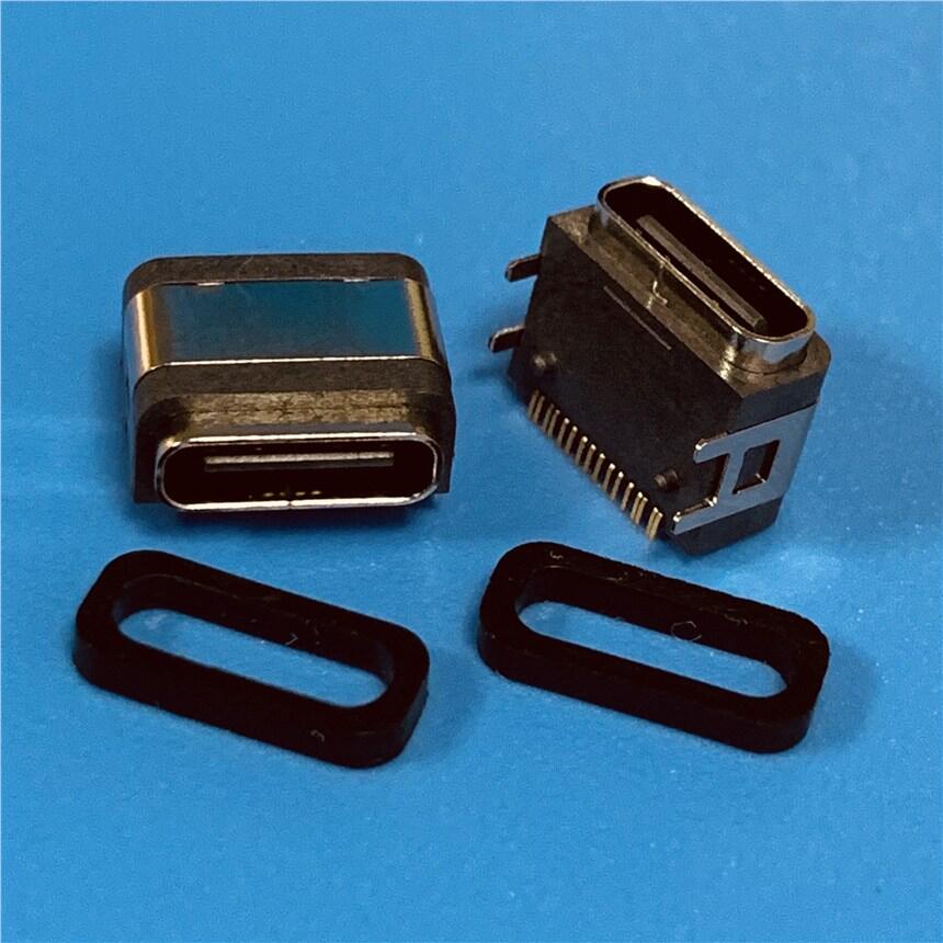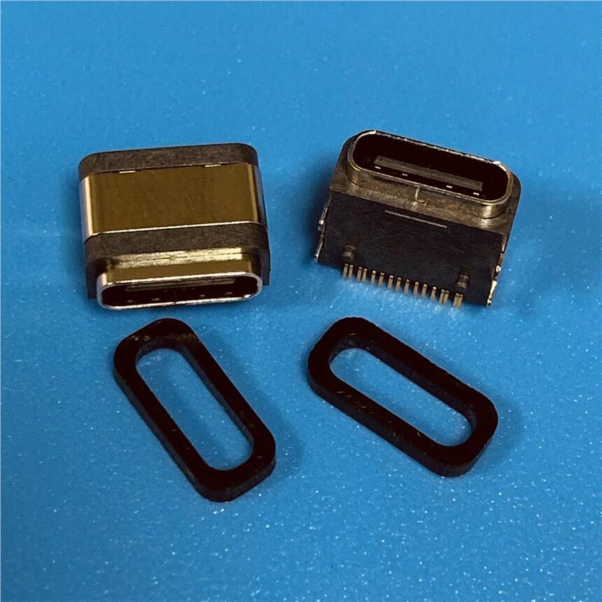 16P卧式贴板防水母座 TYPE-C 16PIN 板上四脚插板 端子贴片防水插座 IP67