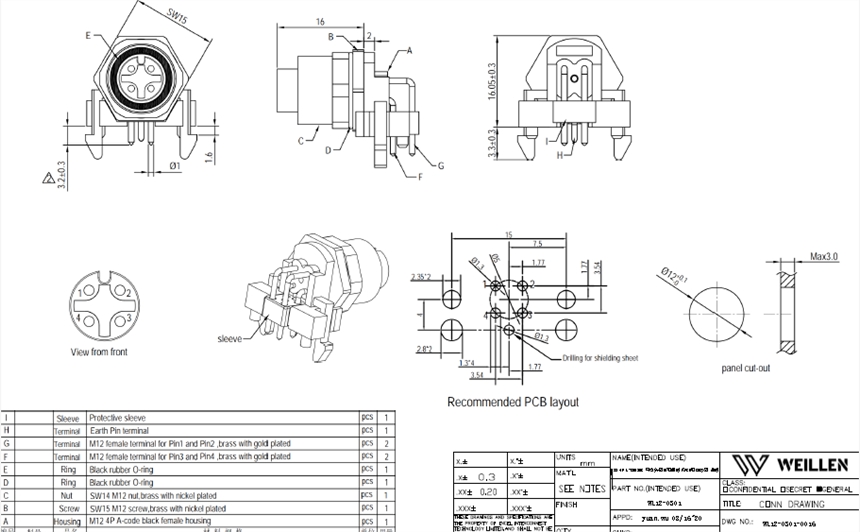 M12 4P A-CODING 母弯头屏蔽型面板式PCB型连接器 前锁
