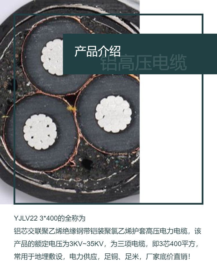 国网电缆集团,是一家多年从事生产YJLV22 10KV 3*400(老牌厂家足铝足米YJLV22 3芯400平方)专车全国供货大量现货)等电线电缆的老牌厂家,本厂生产的各类电线电缆均为纯国标产品,可以通过国标全项检测,实力厂家,库存大量现货,全国专车供货。