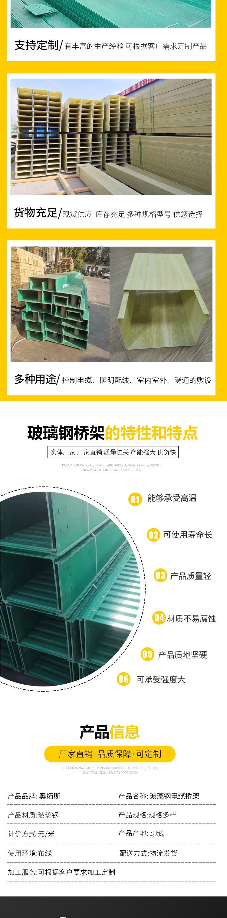 奥拓斯定制玻璃钢电缆桥架耐火隔热性防腐蚀50*25-800*200