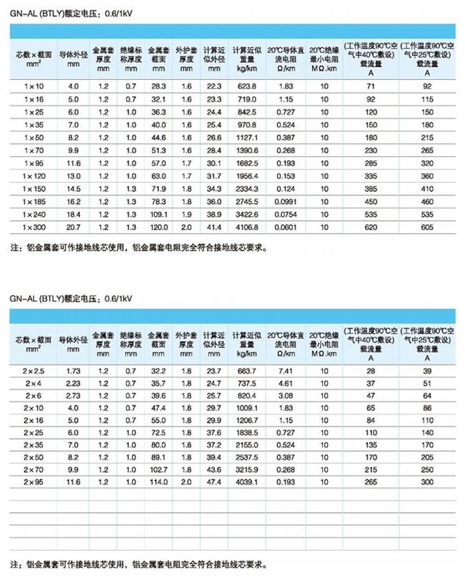 矿物质绝缘电缆NG-A(BTLY)规格如下: