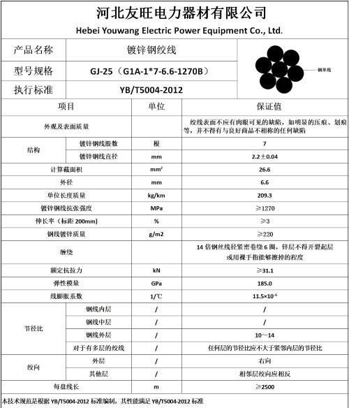 二、 产品执行标准:YB/T5004-2012《镀锌钢绞线》;
