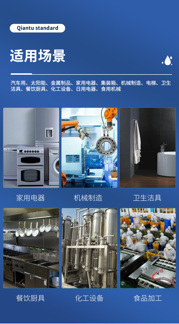 用途范围 | 汽车用、太阳能、金属制品、家用电器、集装箱、机械制造、电梯、卫生洁具、餐饮厨具、化工设备、日用电器、食用机械 | ||