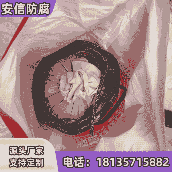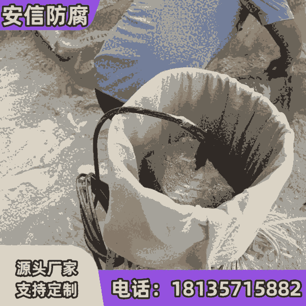 成套预包装镁合金牺牲阳极,由镁阳极锭1支,一根VV-0.6/1*10mm2电缆3米,1根热收缩套管,填包料35kg左右(可根据客户需求来装填包料),棉布袋1条,塑料编织袋1条组成。阳极组装为:棉布口袋内桩镁阳极锭1支将其铁芯上铜焊或锡焊VV-0.6/1*10mm2电缆3米1根,焊接处做绝缘处理,并套有热缩管。镁阳极锭固定中间,周围均匀分布填包料。棉布口袋外套塑料编织袋1条。预包装镁合金牺牲阳极的质量指标为:1.电缆连接电阻:小于0.001Ohm;2.电缆连接强度:超过组装阳极重量的5倍以上。