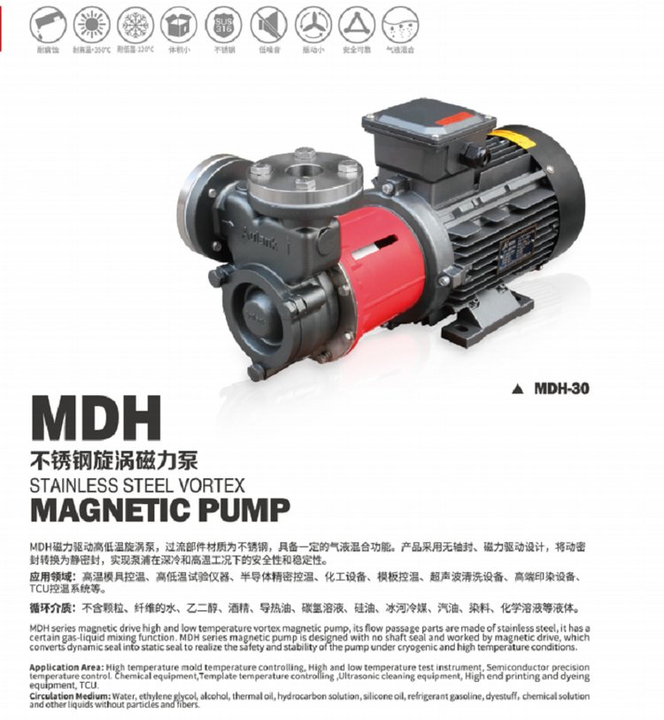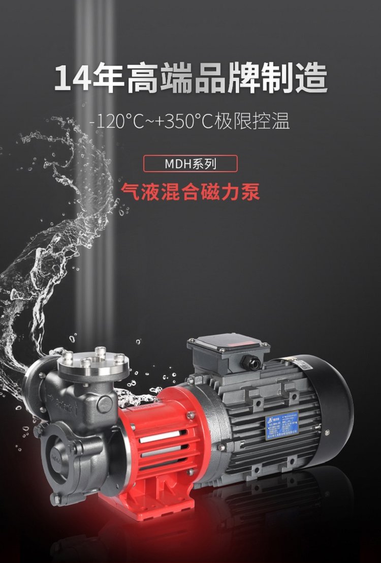 MDH系列泵浦为气液混合泵系列产品,该泵的过流部件全部采用不锈钢材料精铸制成。 气液混合泵的吸水口可以利用负压作用吸入气体,所以无需采用空气压缩机和大气喷射器。高速旋转的泵叶轮将液体与气体 混合搅拌,所以无需搅拌器和混合器。由于泵内的加压混合,气体与液体充分溶解。所以无需大型加压容器罐或昂贵的反应塔即 可制取高度溶解液。 应用于贵重液体,冷媒或高温液体,低粘度液体,腐蚀性液体及苛刻运行和含有气体的液体循环,以及 350℃以内高温导热 油,循环 180℃以内热水、低温-100℃以内防冻液等介质。可根据客户需求,定制变频、防爆、特殊电源等电机