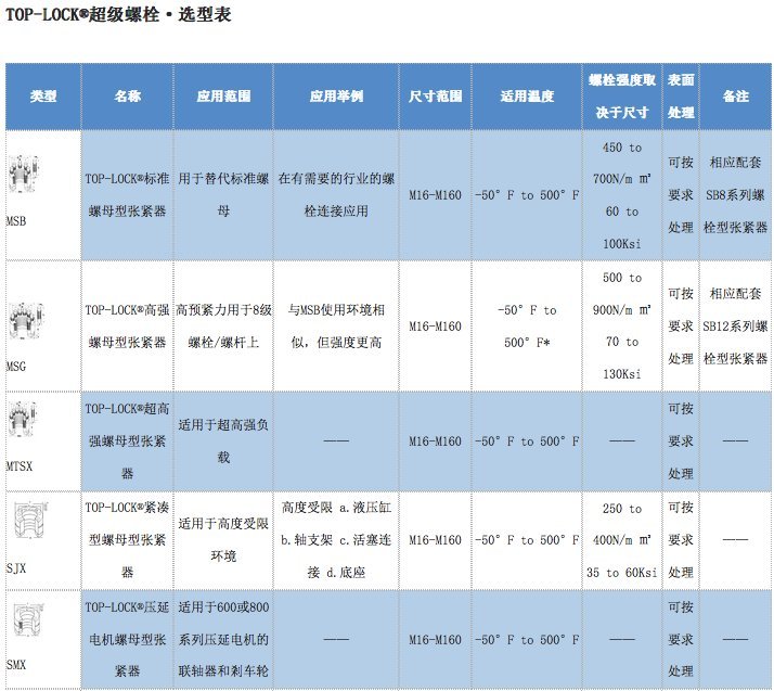 TOP-LOCK主营防松垫圈、多级顶推张紧器(超级螺栓)、钢丝螺套等多种紧固件产品。TP-LOCK全体员工承”诚信为本、客户至上”立业宗旨,在互信互利基础上开发国内外市场。公司产品顺利通过了TS16949、国检检测中心、ISO19001国际质量体系认证、欧盟ROHS环保体系认证等。TOP-LOCK防松·紧固系统承蒙广大客户的支持和公司全体员工的共同努力,公司近年来得到了快速发展。TOP-LOCK品牌得到用户信任和认可。