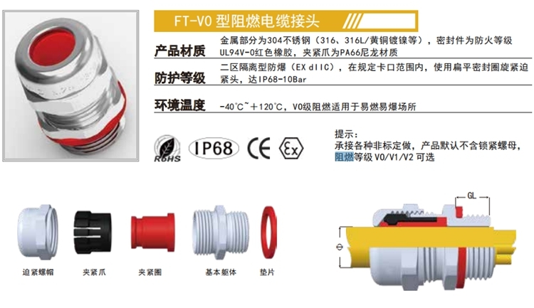 產品說明 :304不锈钢材质精制而成,具有独特的防爆功能,特殊夹紧爪与夹紧圈之设计,夹紧电缆范围大,抗拉力特强,可防水、防尘、抗盐、耐弱酸、酒精、油、油脂及一般溶剂。