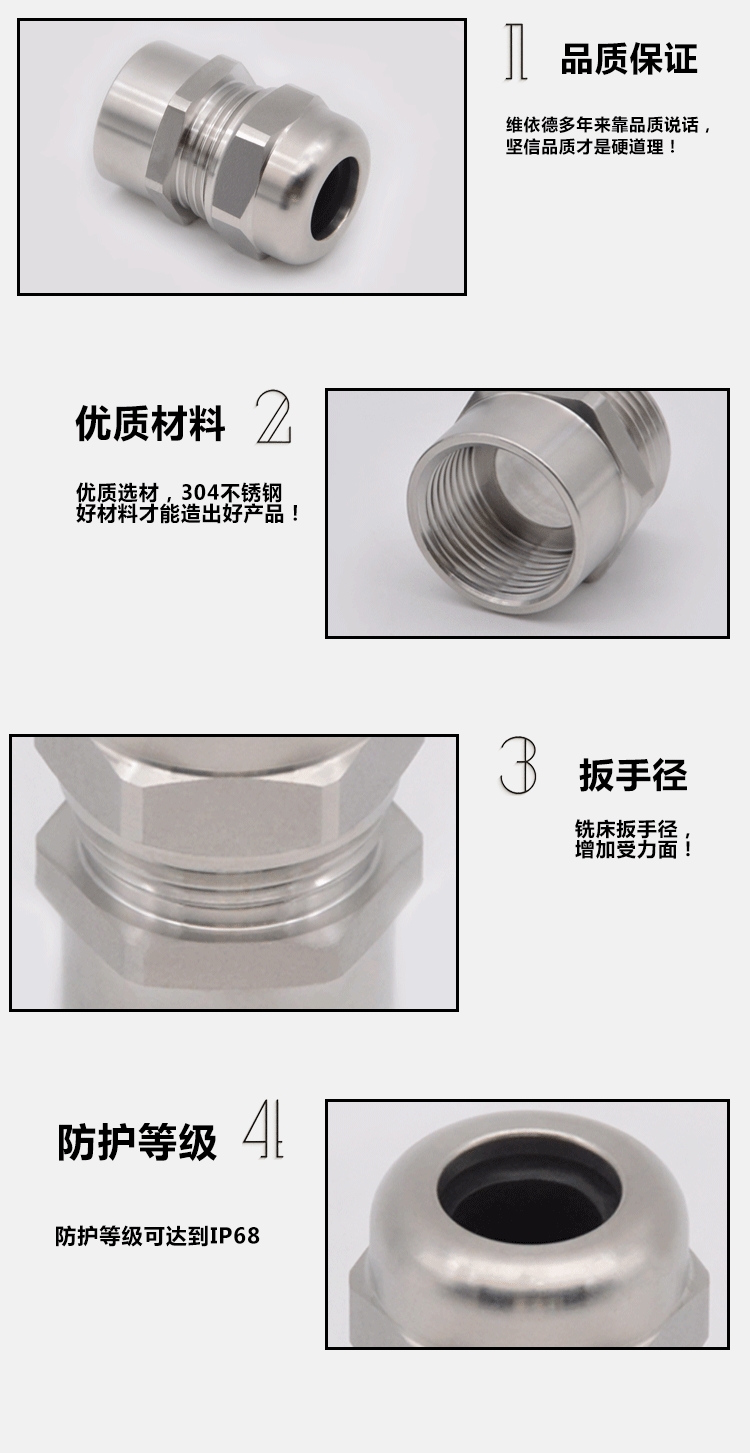 使用方法:维依德FT-SS型304不锈钢接头是海上船舶设备上的必备配线器材之一,304钢材质硬且抗腐蚀性能佳,产品广 泛出口欧盟等国家,深受广大用户的亲睐.