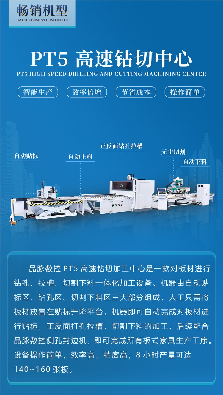 品脉数控新型板式家具生产线方案由一套PT5高速钻切中心和侧孔封边机组成。2个人即可完成板式家具自动贴标、钻孔、开槽、切割,封边全流程的加工。