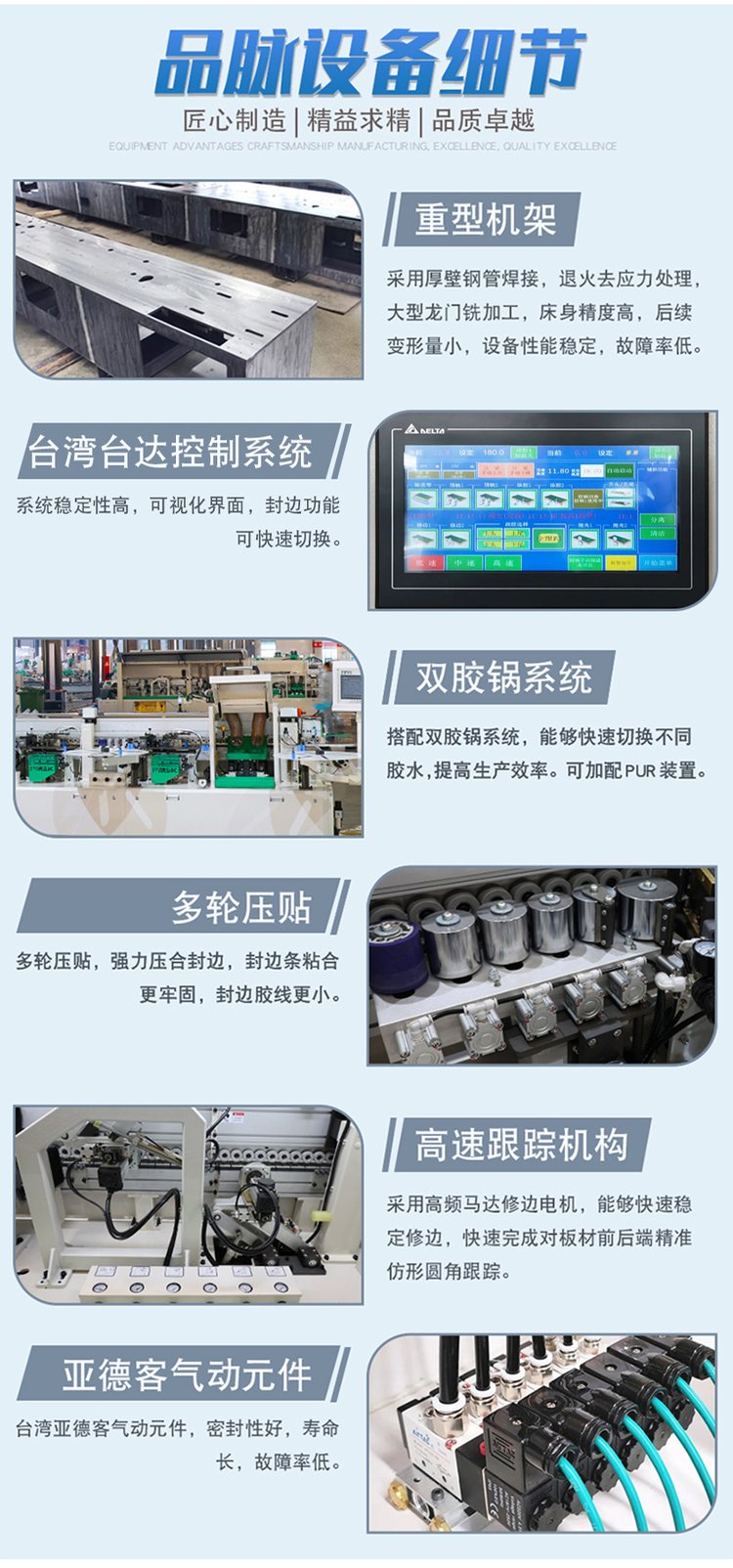 品脉数控PE-668J-2是一款双胶锅预铣跟踪封边机,采用重型机架,高标准装配工艺及知名品牌配件,设备故障率低,封边效果好。可配套中高端板式家具生产解决方案。