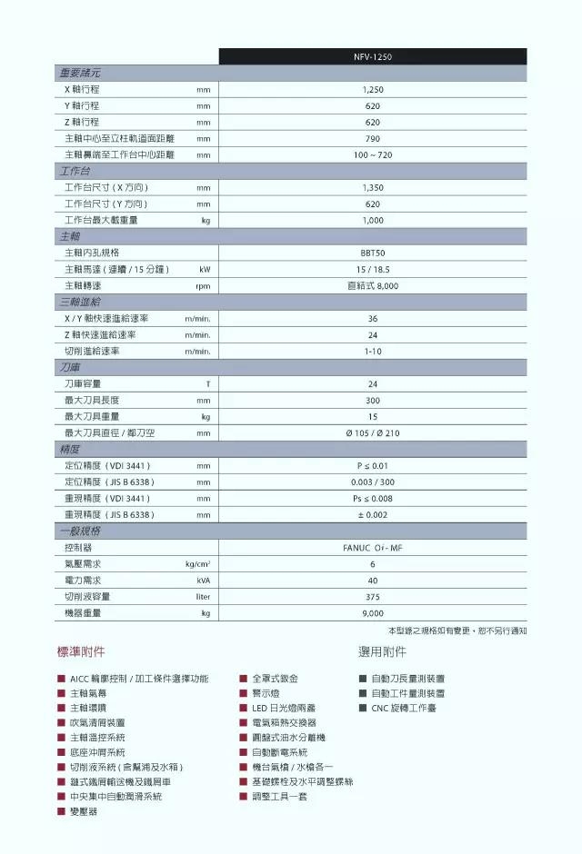 藉著先進的研發技術,專為高精密加工產所設計之 NFV 系列機種,充分展現高精度與高效能的切削能力,是所有同級機種中具備性價比的機種之一。