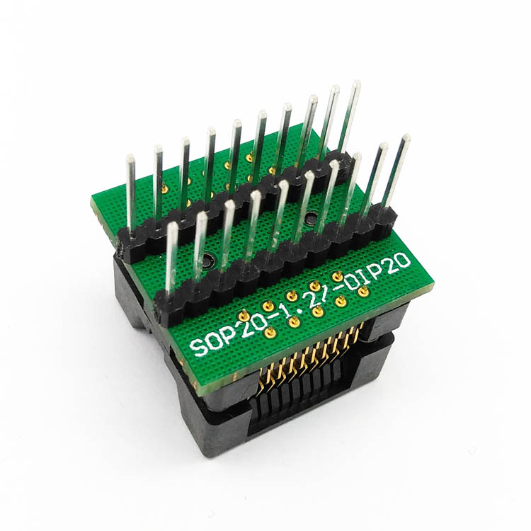 本款烧录座适配芯片规格:SOP封装、20PIN、引脚间距1.27mm、芯片本体(不含引脚)宽度5.4mm。