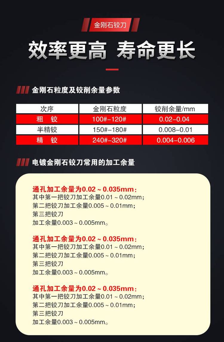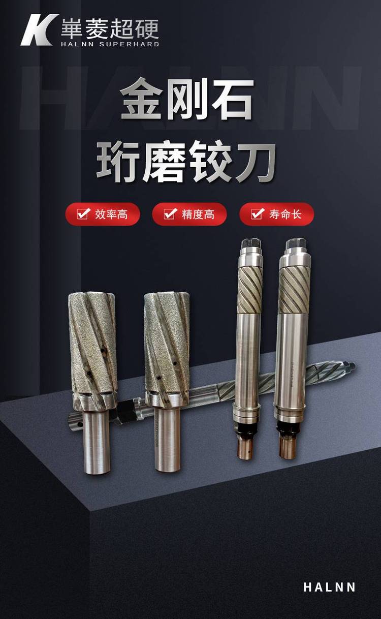 金刚石铰刀是运用电镀原理,通过金属结合剂(镍、钴、铁或铜等)将细小的金刚石颗粒均匀、牢固地结合在钢的基体上,并经过一定的修磨而制成的。是近20年发展起来的一种高精度内孔加工刀具。由于它的加工精度高(一般可达2μm)、表面粗糙度值小(一般可达Ra0.4~0.2μm)、加工效率高(一般可提高3~5倍)、寿命长(一般能加工10000件以上)、质量稳定可靠,因而在液压、农机、汽车、机床、军工等行业中得到了日益广泛的应用。