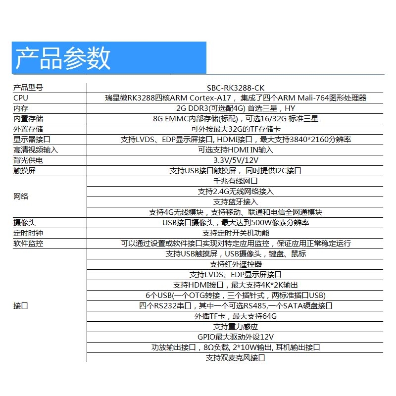 SBC-RK3288-CK多串口安卓主板是一款采用RK3288 CPU开发的安卓工控板,主机板采用工业标准无风扇设计,宽温工作范围-20℃~70℃,适用于大部分工业现场使用。