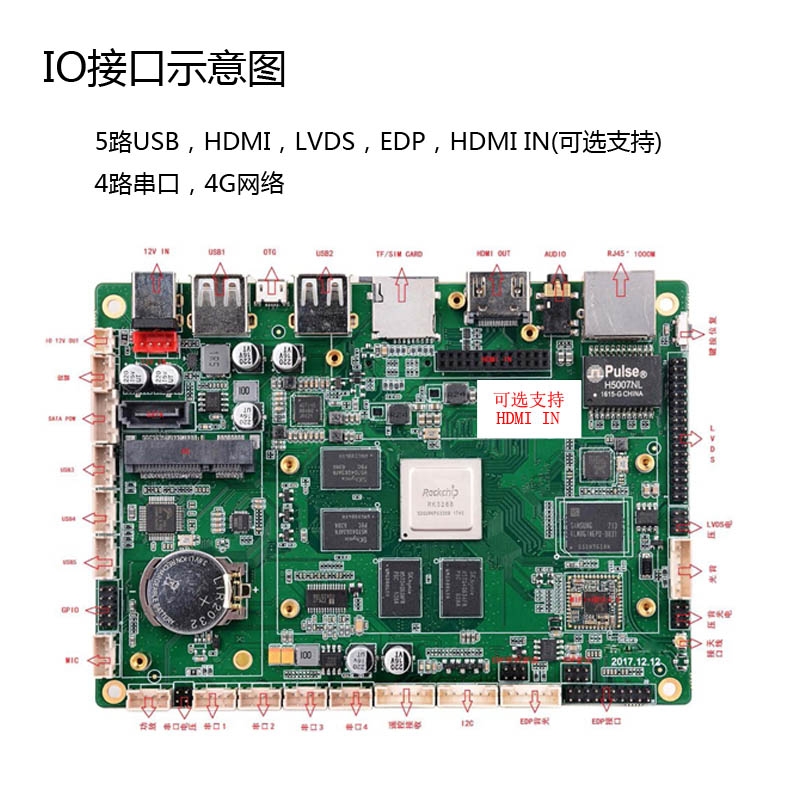 SBC-RK3288-CK工控板设计了4个RS232串口COM,其中一个支持RS485可调,提供4路GPIO接口,支持千兆网卡,wifi,4G无线网络模块,支持LVDS液晶屏接口,支持HDMI输出,可选HDMI IN视频输入端口。RK3288安卓工控板采用直流12V DC输入,整板功耗5W左右。