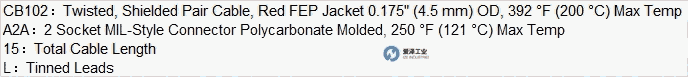 双绞屏蔽电缆,红色 FEP 护套,外径 0.175" (4.5 mm),温度<= 392 °F (200 °C);电缆总长度:15 英尺;连接器 1:2 插座 MIL 型,聚碳酸酯模压连接器,永久 安装,温度<=250 °F (121 °C) ;连接器 2:镀锡引线