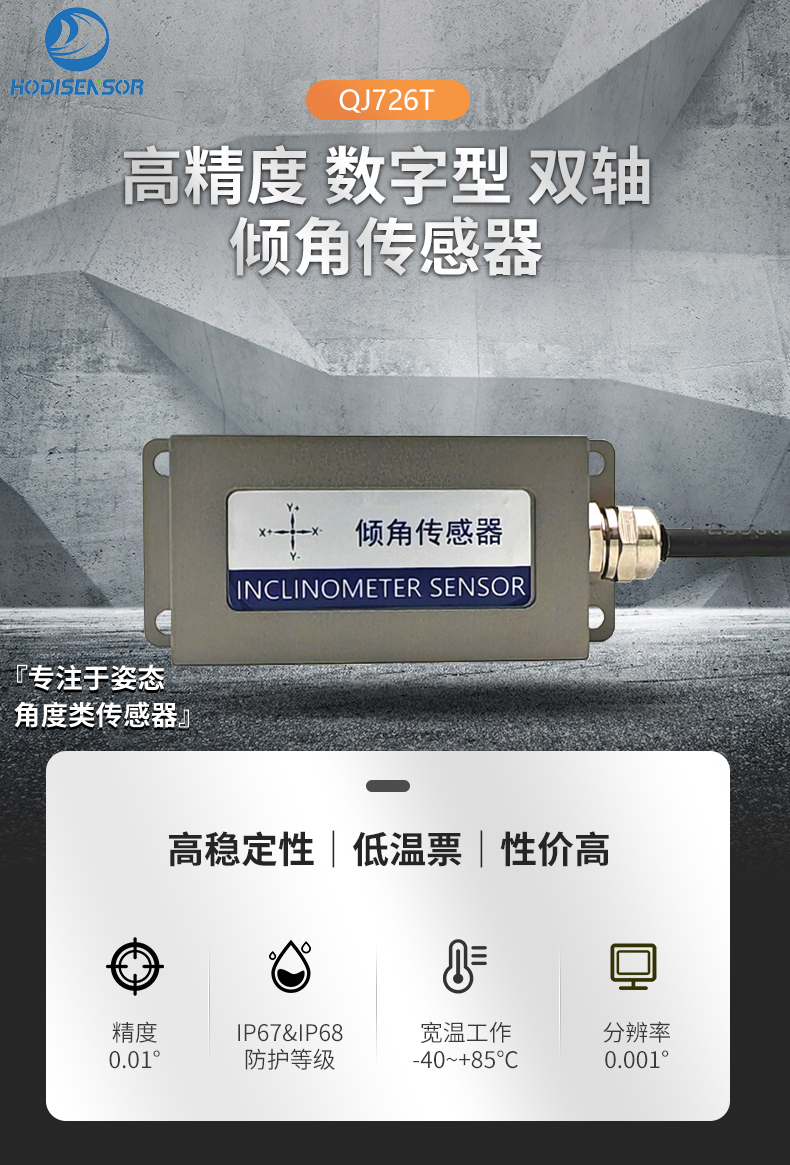 高精度QJ726T三轴倾角传感器,绝对精度0.01°,输出RS485