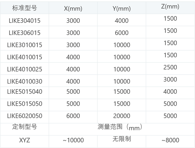LIKE系列龙门式三坐标测量机专门为大尺寸高精度要求的工件测量提供了解决方案,被应用于大型工件的精密测量,如航天航空、高铁、船舶、大型模具、大型齿轮等行业。