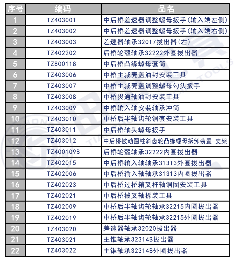 功能用途 | MCA16中后桥驱动总成专用卡车维修工具 | ||