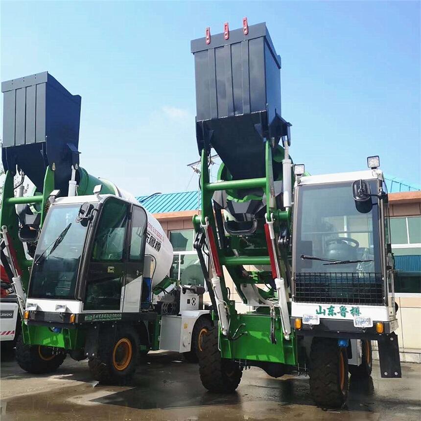 “重型”球形鞍座上安装的反力架可以 270°液压旋转,并且通过液压式制动器自动锁止。滚筒旋转通过齿轮泵和开路中的摆线液压马达实现,在操作室内和搅拌机后部拥有手动电气阀。滚筒通过 2 个双作用千斤顶升至水平位置。