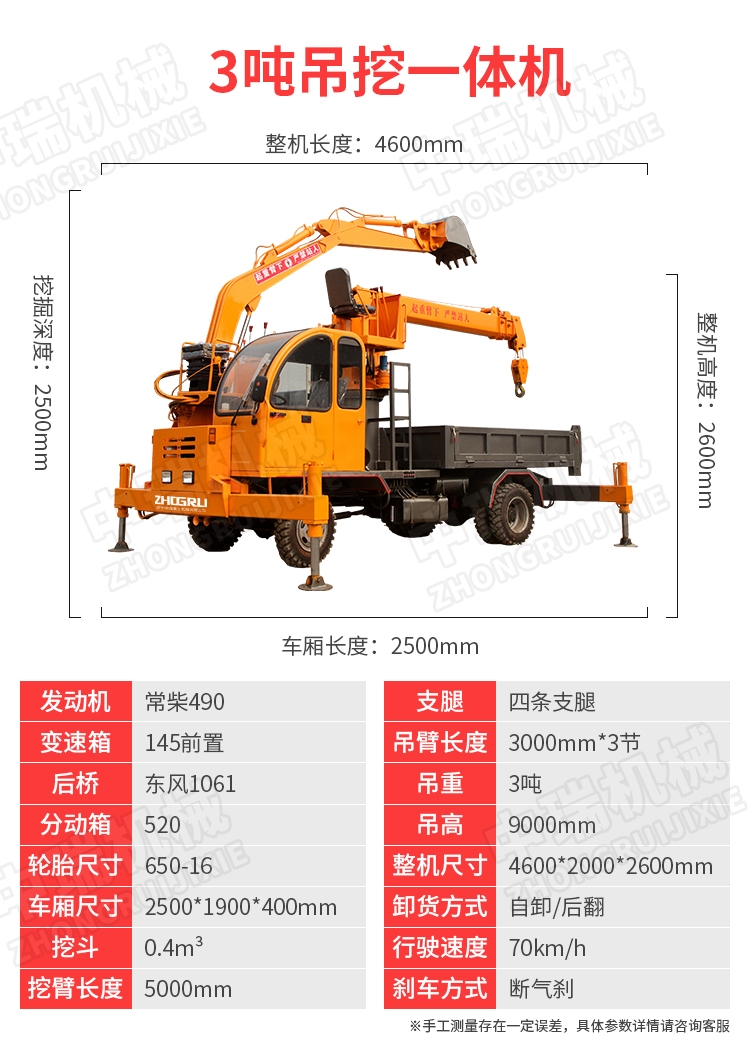 吊挖一体机是一款集挖掘、吊运,运输于一体的一款工程车辆,其在实际应用中的表现完全满足客户的需求,尤其是沙场拉沙,土方倒运,垃圾转运等方面效率高。底盘采用工程四不像车底盘,挖掘部分和履带式挖掘机一样,可以进行360度旋转,操作非常方便。