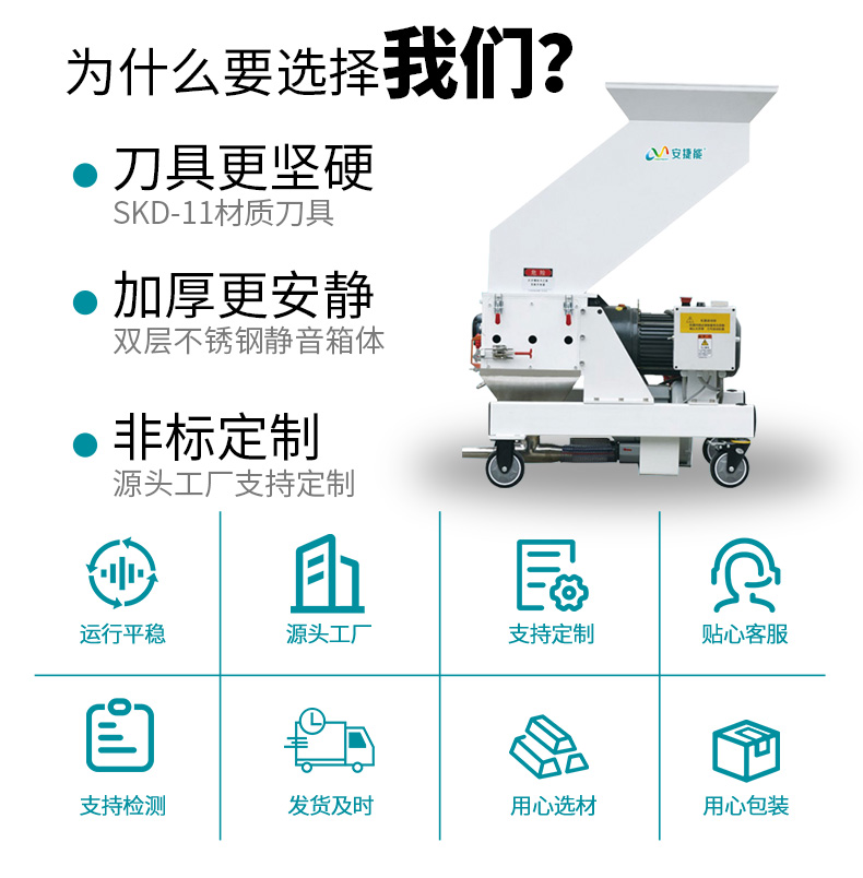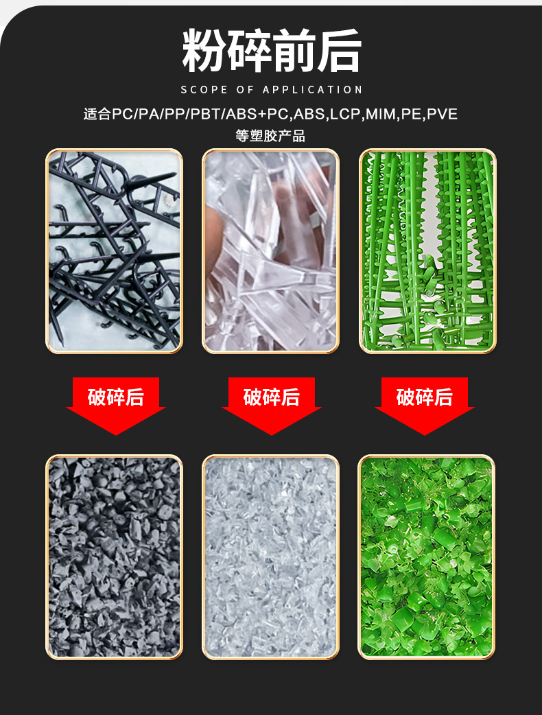 适用原料 | 硬质水口料、机头料、纤维料、亚克力制品、工具外壳、尼龙加纤 | ||