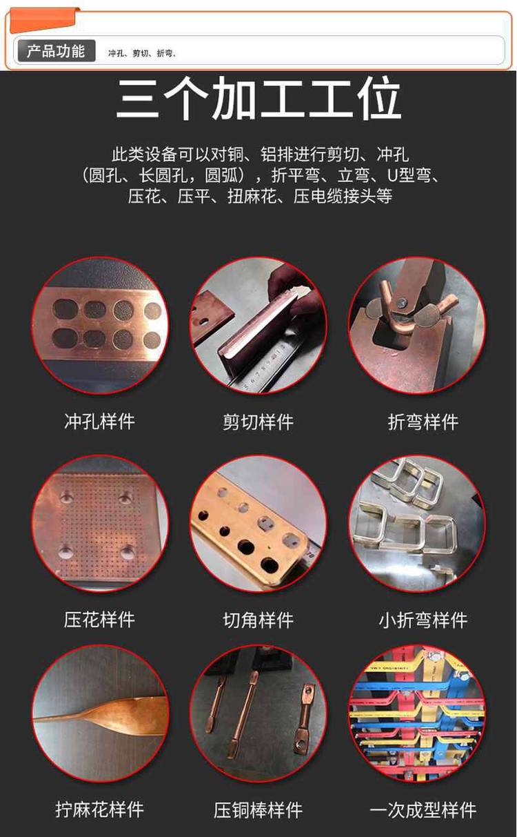 ????本系列母线加工机有冲、剪、折三个单元,主要功能为加工不同规格的铜、铝母线,只需用相应的加工单元,就能方便、快捷的对铜、铝排进行剪切、冲孔(圆孔、长圆孔),折平弯、立弯、压花、压平、等各种不同的加工。