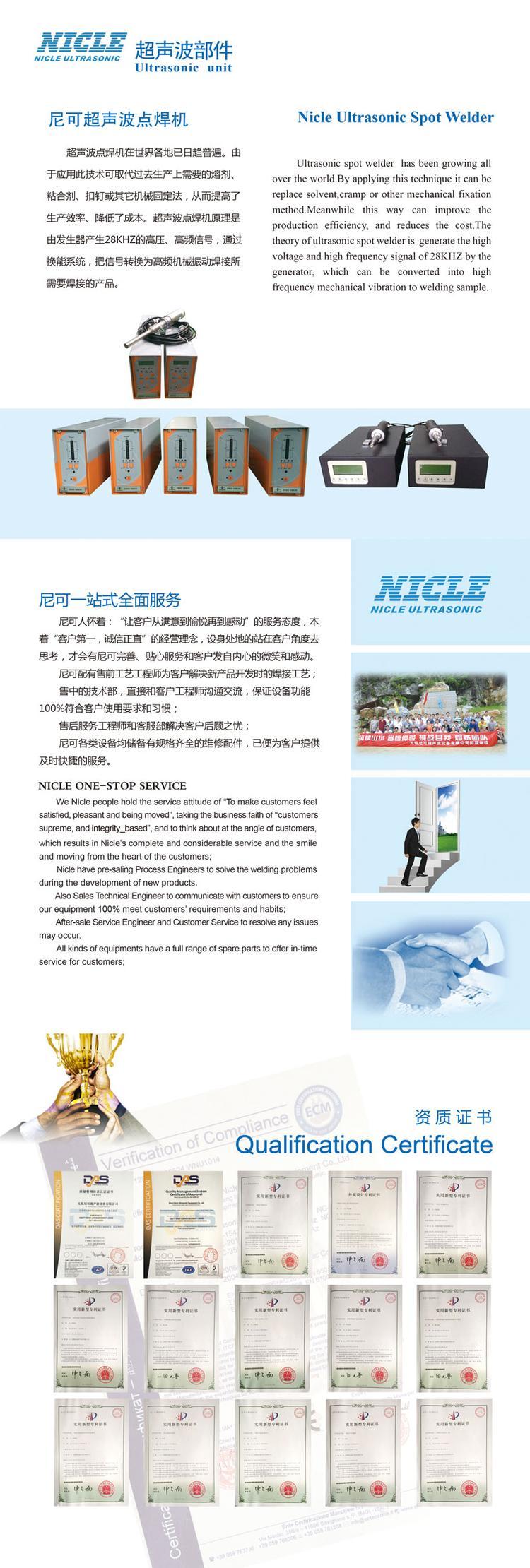 1.智能型超声波共振频率为20KHZ??2.超声波输出功率为1200W?3.电源要求为220V(单相)?超声波塑料点焊机的优点:1、自动追频:开机自动检测机器与模具的焊接数据,自动进行追踪,并储存焊接记忆频率。2、智能保护:功率过载、设备温度过高、频率偏差过大、负载连接线不牢、焊头损坏、电流过高等保护。3、开机自检:开机自检并作出相关提示,防范不良于未然,而且方便维修。4、振幅可调:焊接过程中可以随时调整振幅的大小,从10到100,精确到1。焊头最大温度可达到80度不报警的优点。有效减少激穿、烫伤等不良品。? ? ? ??无锡尼可超声波设备有限公司产品中心成立了多年,是一家专业从事超声波工业设备、塑料焊接设备、金属焊接设备研制、生产、销售、服务为一体的现代化高科技民营企业。主要生产基地位于工业完善、教育发达、交通便利的长江三角洲——江苏无锡,有着高质量的超声波零部件供应、高水平的超声波焊接工程师以及快速便捷的物流,因此有能力为客户提供全方位焊接服务。自成立以来,不断的提升超声波焊接技术水平和超声波焊接设备制造能力,已经飞跃成超声波焊接领域的先驱者。? ? ? ? 尼可一直致力于为焊接客户提供最有价值的塑料焊接与超声波应用解决方案,以优质的产品和优越服务来提高客户市场竞争力,创造客户价值。我们一直以“服务客户,实现双赢”为目标。经过不懈努力我们已经为几百家企业提供超声波焊接设备及服务,尤其是跟无锡索尼、阿尔卑斯、TCL、西门子、通用电器、楠见、海纳、英利、比亚迪、英提尔等大中型企业建立了长期合作关系。? ? ? ? 我们秉着“客户第一、团队合作、自我突破”的经营理念,“市场需求为导向、技术进步为动力、客户满意为准则”的发展理念,“始于客户要求,终于客户满意”的服务理念。为客户提供更优良的超声波焊接设备和更优越的超声波焊接服务。?? ? ? ? ?尼可具有较强的超声波焊接机设计、研发、生产能力,可为广大用户按需定制各类专用超声波焊接设备。公司已全面通过多方认证,产品的研制、生产、销售及服务都严格按质量控制程序和检测标准执行,各主要电器元件,关键零部件均直接采购进口名牌产品,并引进进的实验与检测仪器设备,保证产品质量。多年来,尼可持续改进生产工艺、严格控制产品质量、不断加大技术开发的力度和投入,并积极引进国内外先进的行业技术,制造技术领先质量优越的产品,为国内外客商提供全方位多途径的优质产品与服务。?? ? ? ? ?尼可可以为您提供超声波塑料焊接机、超声波金属焊接机、塑料热熔焊接机、塑料热板焊接机、高周波高频焊接机、汽车专用焊接机、无纺布专用焊接机、非标准焊接机和超声波焊接模具。我们在塑料焊接及超声波应用领域有着非常领先的技术和丰富的行业经验。我们的产品在家电行业、汽车行业、电子行业、航天航空、精密五金、包装行业、玩具行业、纺织行业等的各类产品制造中都得到了成功而高效的使用。?? ? ? ? ?尼可超声波有详细的售后服务体系,提供长久的焊接指导服务。积极与客户合作,把售后服务工作做到最好,秉着“积极合作、共同进步、创造双赢”的原则为客户提供高水平的服务!