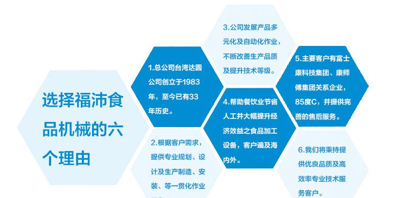 台湾达圆公司在1995年即完成全面导入自动化管理作业,并迅速从中央厨房、调理设备的单一生产作业提升到自动化的蔬菜前处理生产线,烹饪、油炸生产线等各型食品加工整厂设备的设计、制造及规划。本公司多年丰富之实际经验更可为客户提供各种整厂设备之可行性评估。