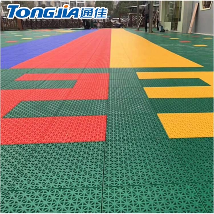 悬浮式拼装地板采用成熟的高强度聚丙烯环保材料,有效解决地板热胀冷缩问题的同时还具有稳定的表面摩擦,抗紫外线添加剂被加入到每一块地板中,能够保障地板在长期受日光照射中不褪色,悬浮式的结构设计加上坚固的加强型支撑脚结构,创造卓越的垂直的减震效果,防滑的表面可有效防止运动损伤,良好的球回弹性能和球速保证了地板卓越的运动性能,适于生产用于铺装理想的高性能篮球场、网球场、五人足球场、轮滑球场、乒乓球场以及排球、羽毛球等多功能球场。