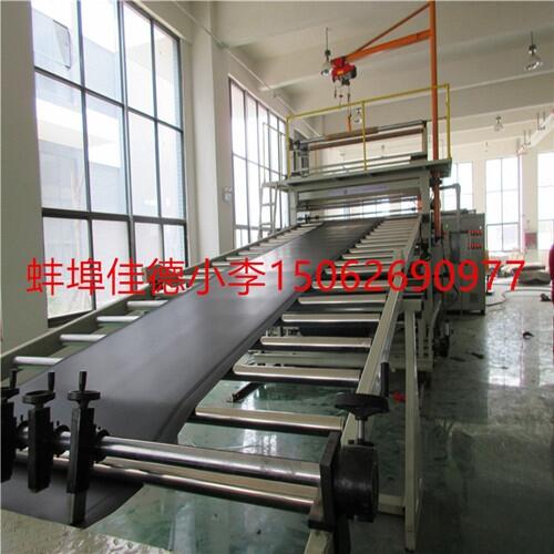 M密炼机→JDL自动提升机→JDL强制喂料机→JDL单螺杆→成型模具→三辊压光机→牵引机→板材电晕处理→切割机→堆放