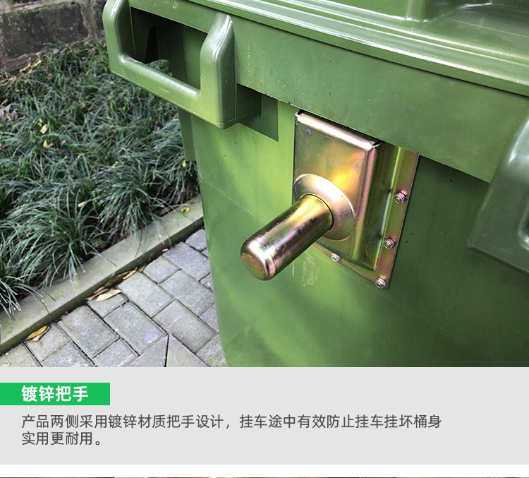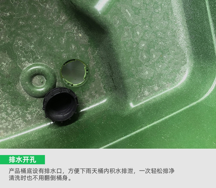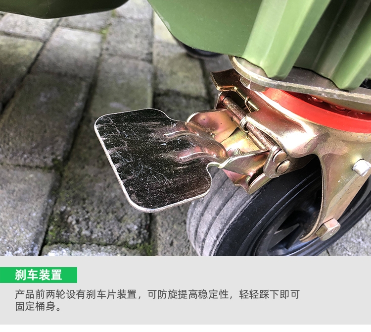 9、把手为镀锌不锈钢轴,增加把手使用寿命,桶底配有排水口,使用方便。10、加厚万向轮:轮毂及辋圈为高密度聚乙烯材质,轮胎为100%橡胶材质。且垃圾桶前轮均带有刹车装置,可防旋转,提高垃圾桶稳定性。