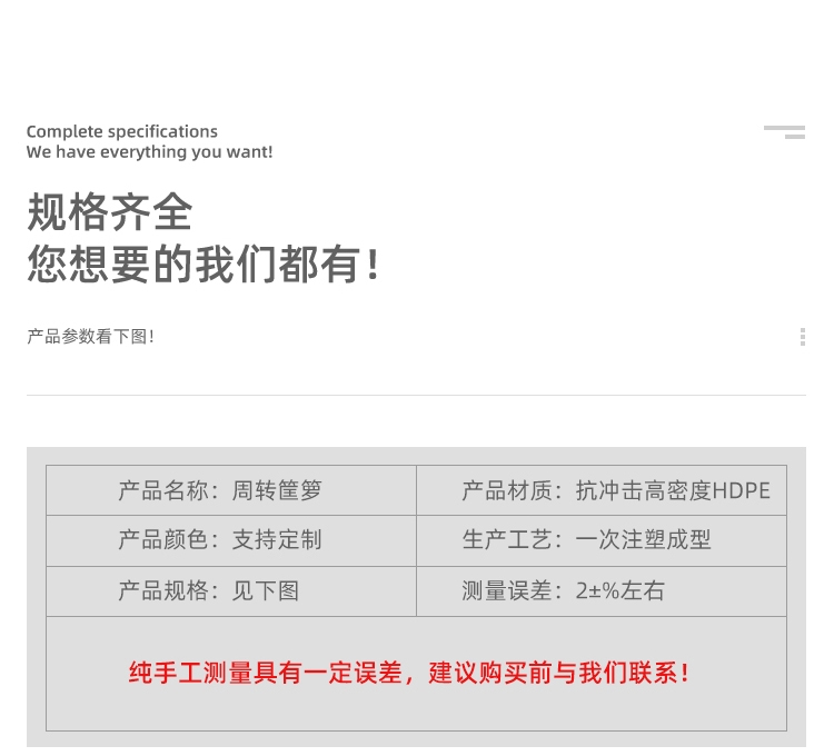 1. 产品尺寸:外径1040*650*540mm、内径1000*610*530mm长宽高。