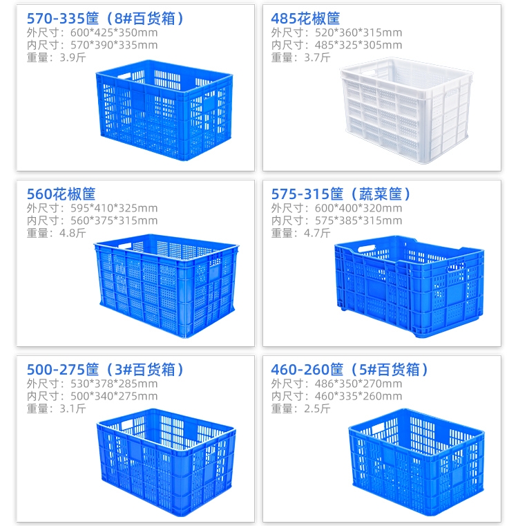 周转箩分为网眼可叠、网眼可套、封闭可套几种,适合仓库、生产流水线、厂区内部周转。可叠型适合堆垛,可套型不适合堆垛,但使用完毕后可节省空间。网眼型只可堆放固体物品,封闭型即可堆放固体物品,又可堆放液体物品。一次性塑料筐。 周转筐按性能也可分为一般周转筐和防静电周转筐!