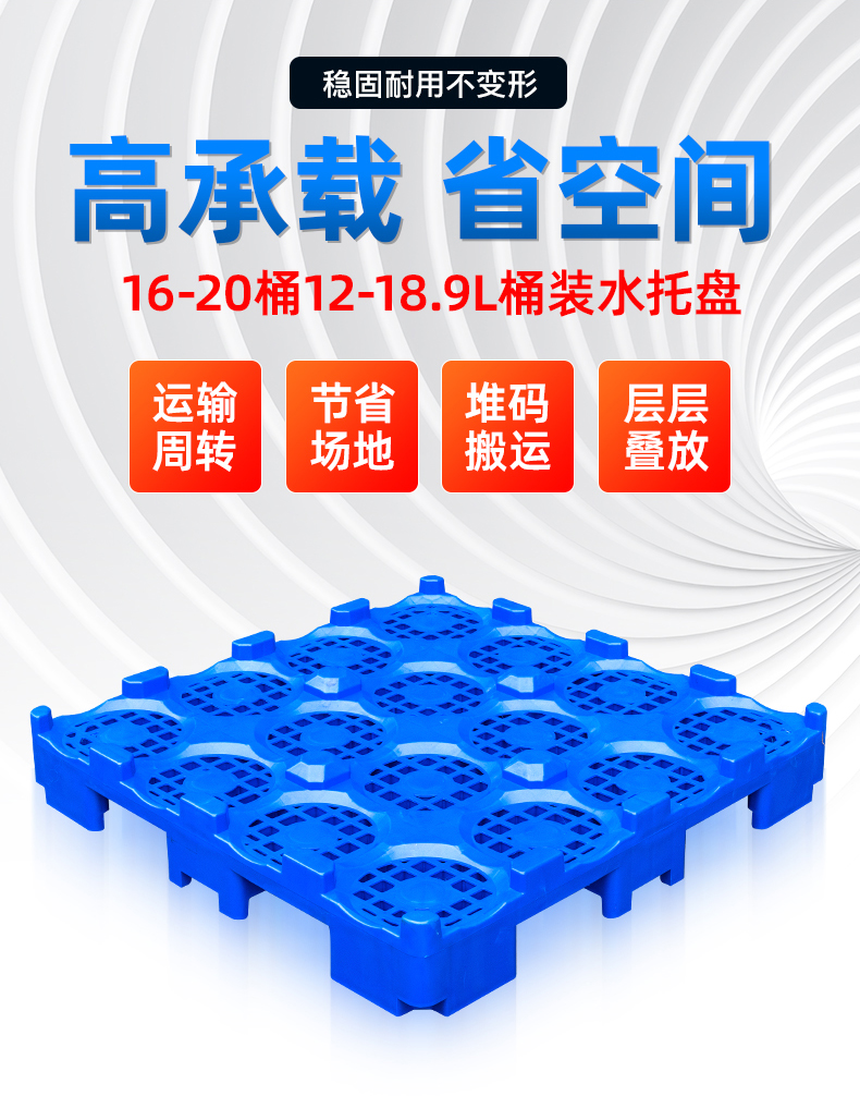 桶装水托盘不同于仓储托盘,桶装水托盘是饮用水行业专用的塑料托盘产品,尺寸通常为1080*1080*180mm,单层可放置16桶5加仑桶装水,桶装水托盘采用优质刚性佳、耐热的优质PP及耐冲击、耐低温、耐酸碱侵蚀的优质HDPE(高密度聚乙烯)为原材料一次注塑而成型。塑料桶装水托盘的应用,大幅提高了土地利用率和装载效率,节省人工人力,避免了桶装水在装卸过程中产生的货损及污损,同时,托盘标准化应用还有以下好处: