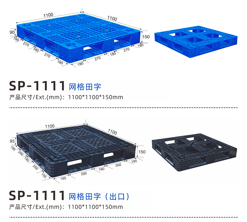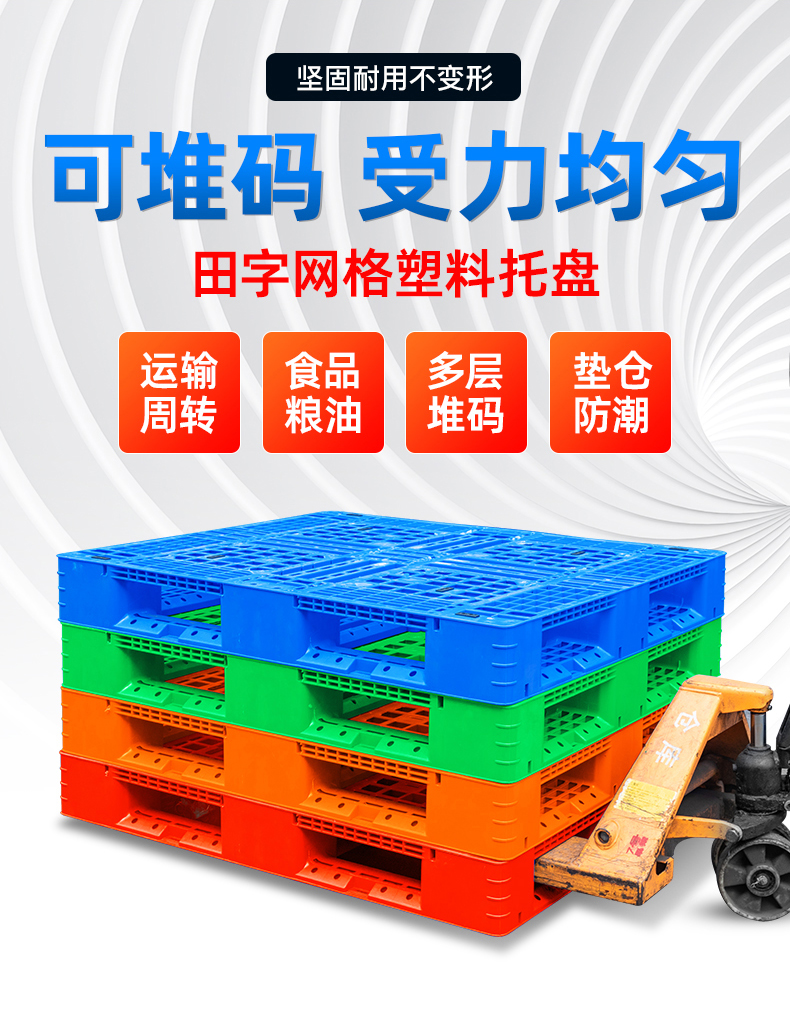田字网格型:田字网格型塑料托盘采用全方位镂空加强筋设计,有效防止托盘损坏增加产品载重能力、抗压能力、抗冲能力。